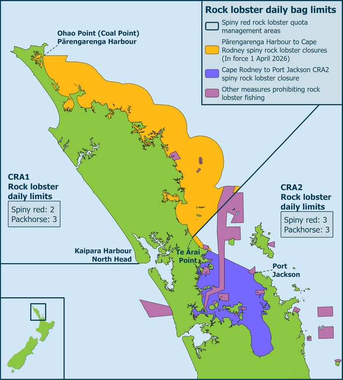 Know the fishing rules. April 1 2026 makes the start of the closure of Northland's east coast, from Pārengarenga Harbour to Cape Rodney. The map below shows where you can and can't collect.