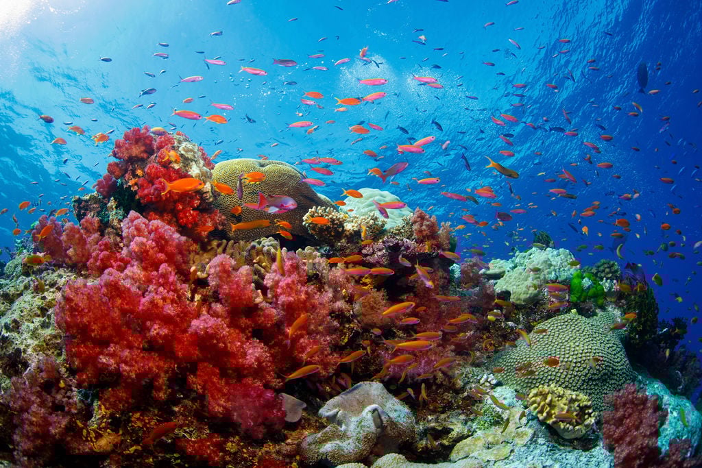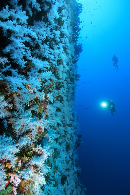 Further north, Taveuni is home to some of Fiji’s most iconic dive sites, including the world‑famous Rainbow Reef. This area is celebrated for exhilarating drift dives through coral‑covered channels and stunning walls alive with soft corals, pelagics and dense reef fish populations.